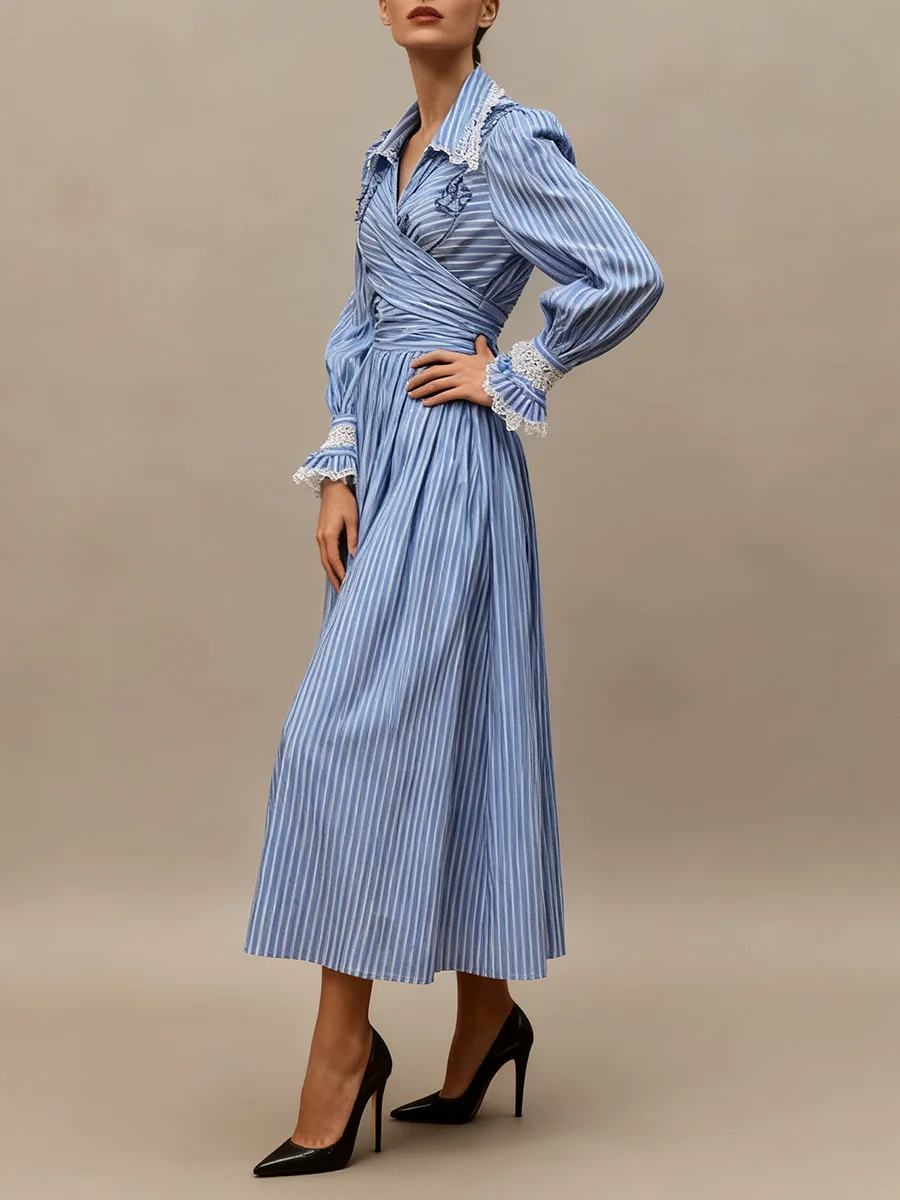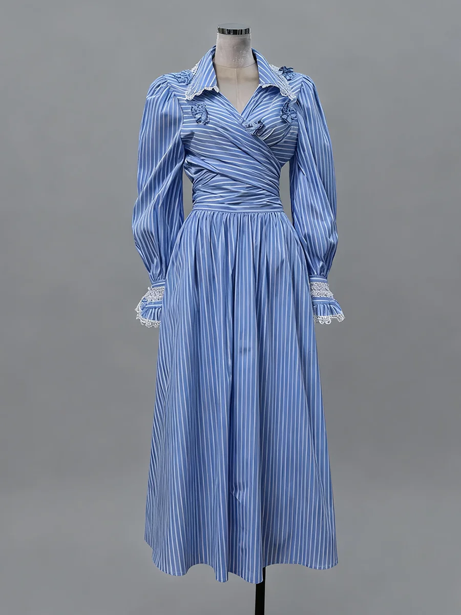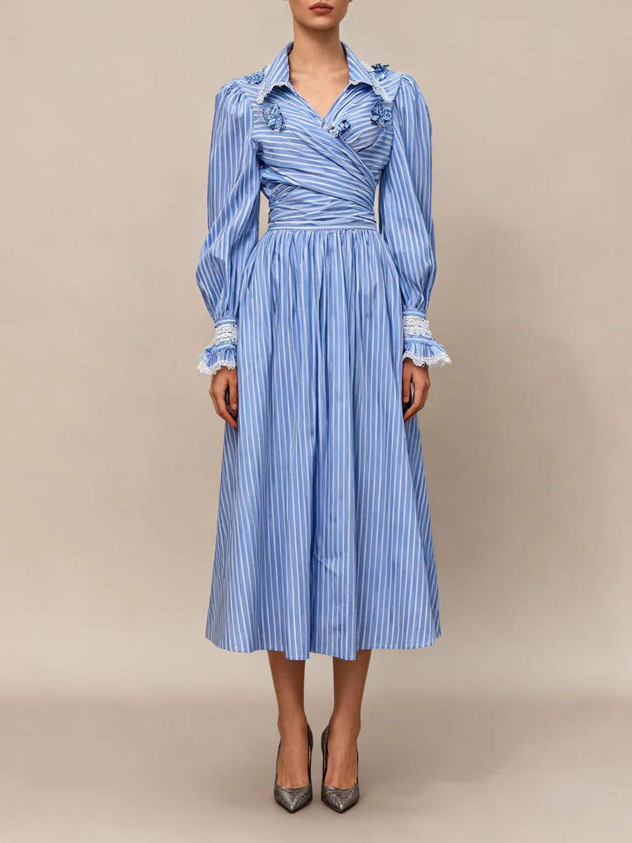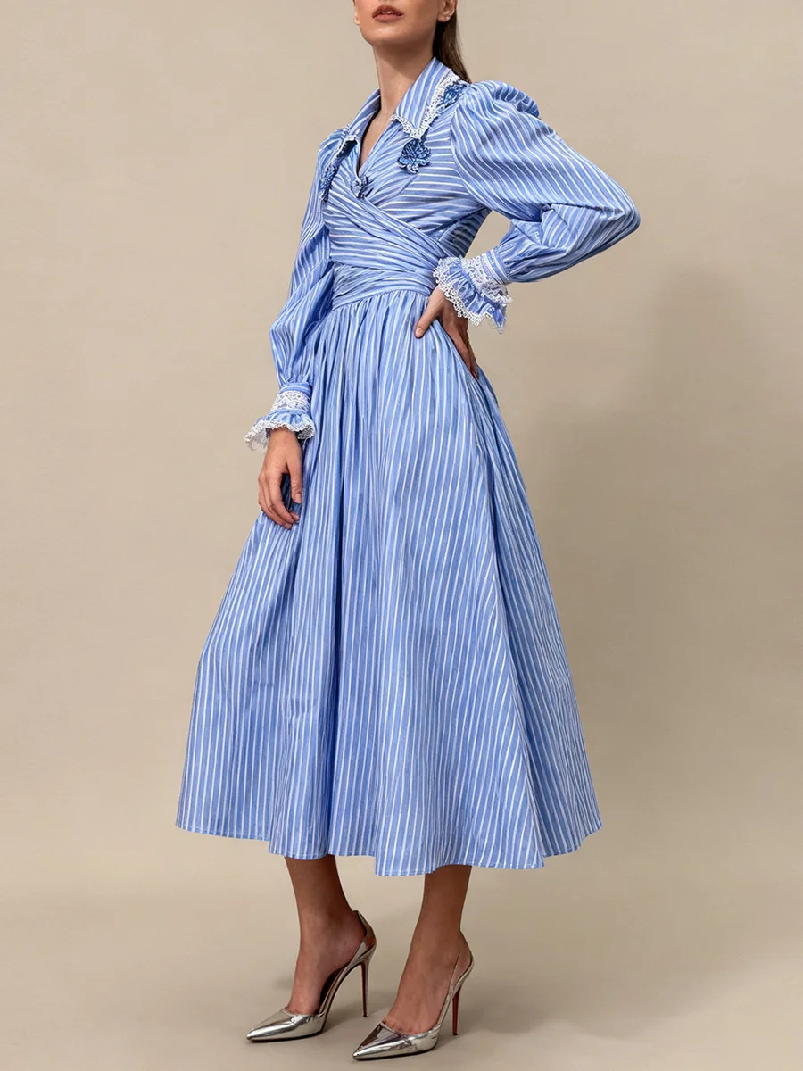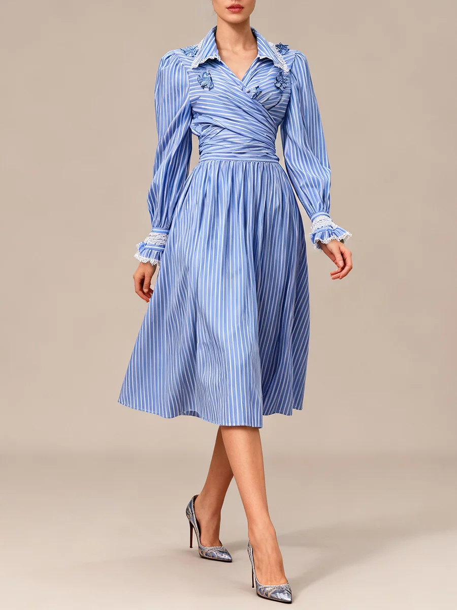 Striped Two Piece Set for Women Laple Lantern Sleeve Patchwork Floral Crisscross Bandage Top Mid Skirt Office Suit Female