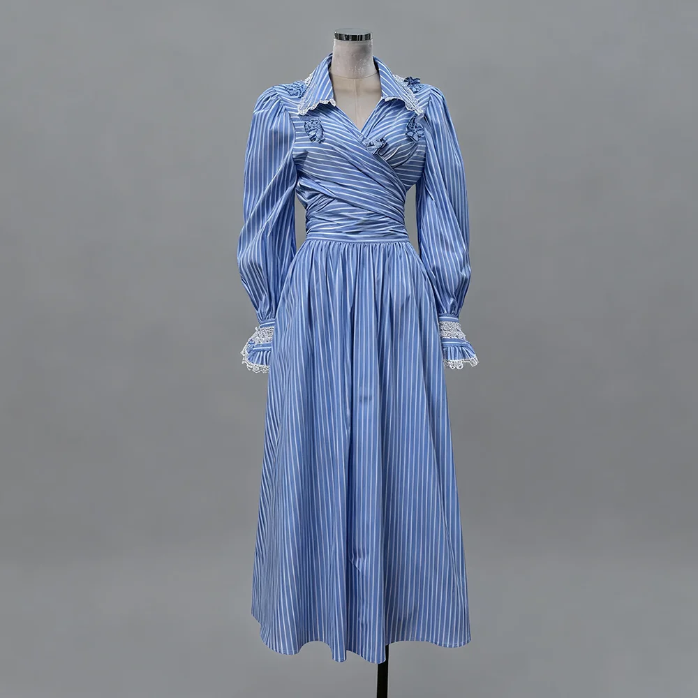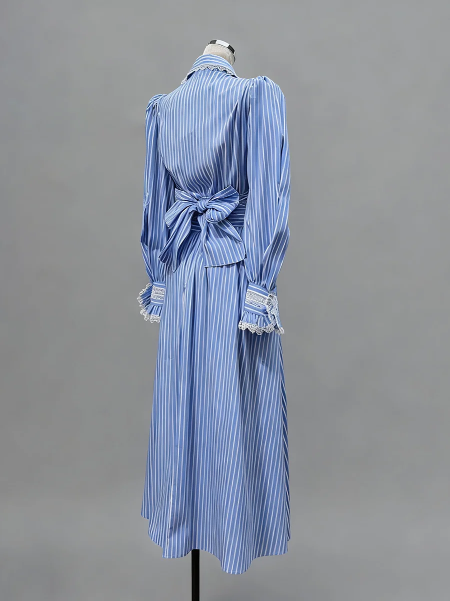 Be the first to review “Striped Two Piece Set for Women Laple Lantern Sleeve Patchwork Floral Crisscross Bandage Top Mid Skirt Office Suit Female”